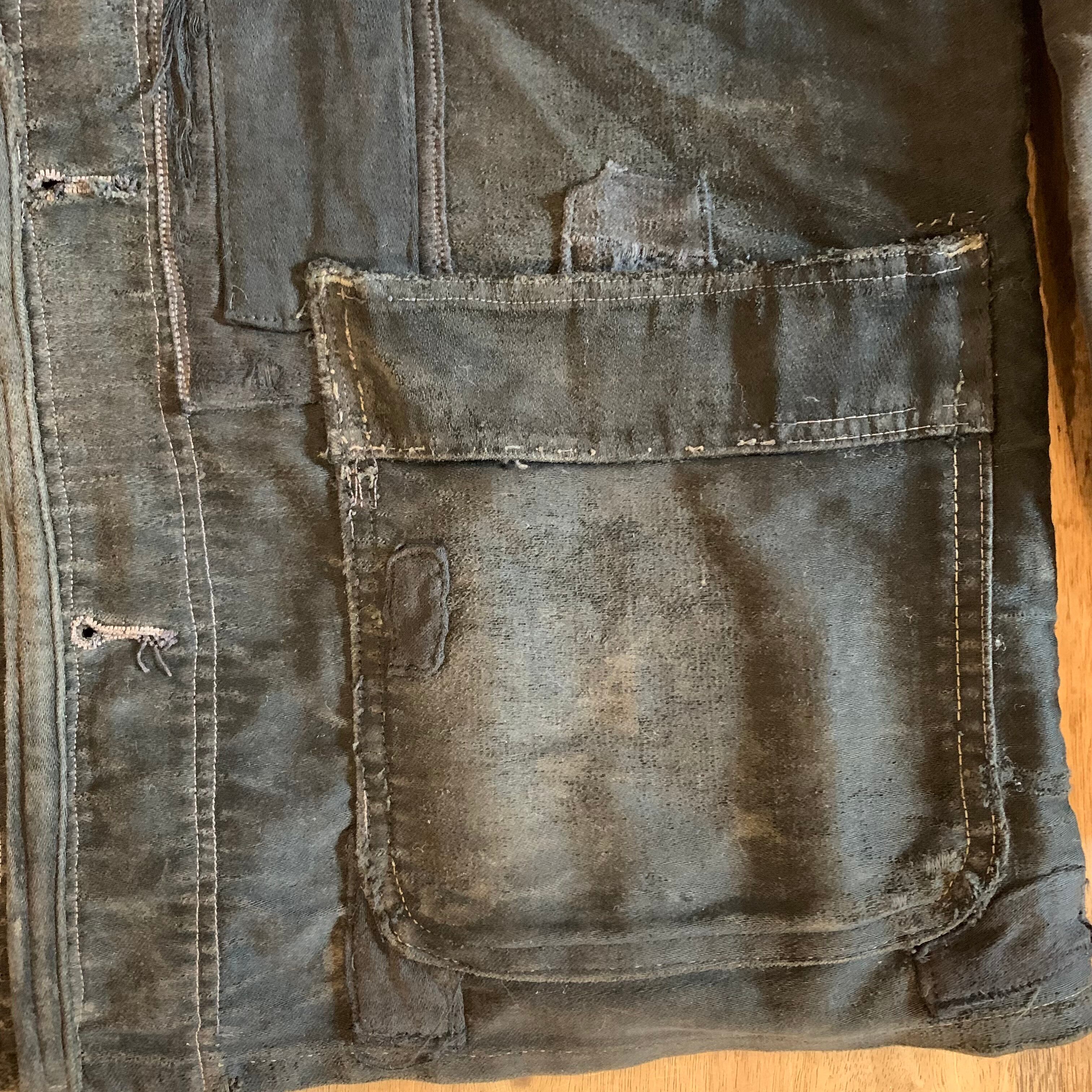 補修箇所や穴空き箇所などをすべて文章や写真でお伝えするのが難しい状態ですが、丁寧と雑な補修と、放置された穴と染み汚れが色落ちの具合と混ざり合って芸術的な雰囲気を醸しています。この雰囲気でブラックモールスキンのものとなるとなかなか見つかる機会は多くないかと思います。
